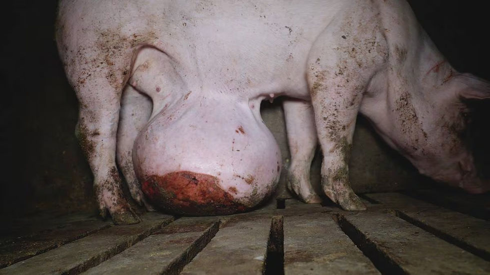 Los cerdos de engorde sufren inflamaciones en las patas que les impiden moverse, otros sufren de graves hernias. Un cerdo presenta una enorme hernia, de unos 7 kilos de peso en el abdomen y se desplaza con mucha dificultad mientras arrastra la hernia. Estas malformaciones causan graves lesiones en la piel y pueden provocar afectación de órganos internos.